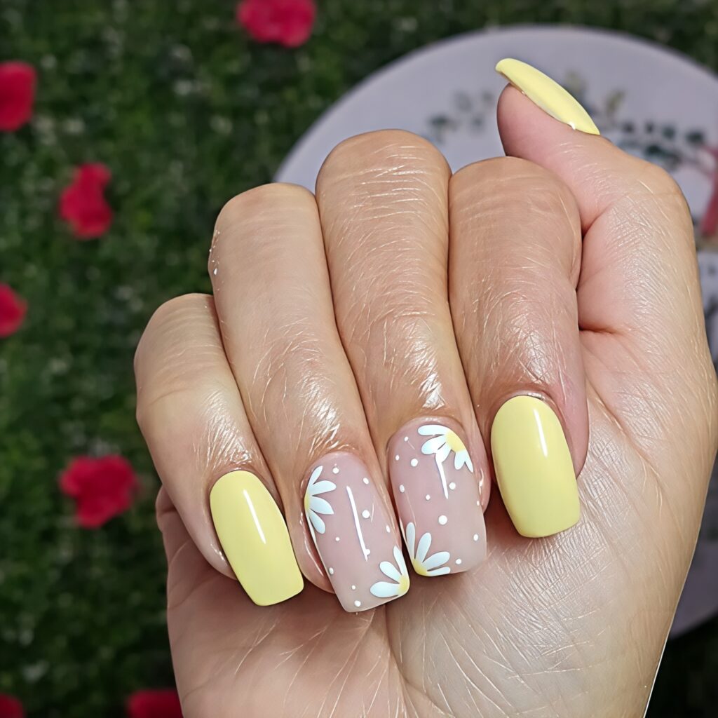 Soft yellow nails look bright but gentle at the same time. The light yellow shade reminds us of sunshine and warm summer mornings. Tiny white or pink flowers are added to make the design more cute and sweet. The short coffin shape makes it comfortable for daily use. This style is simple but cheerful. It is perfect for girls who love soft colors and small floral details.