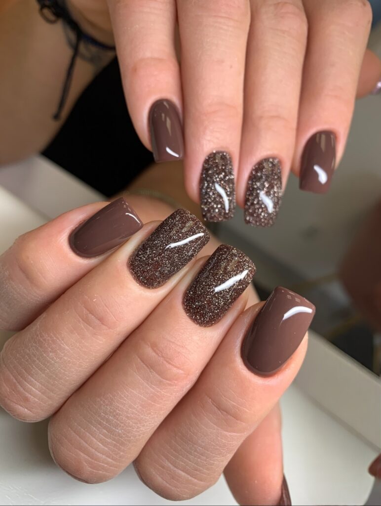25. Deep Chocolate Short Coffin Nails with Glitter Accent