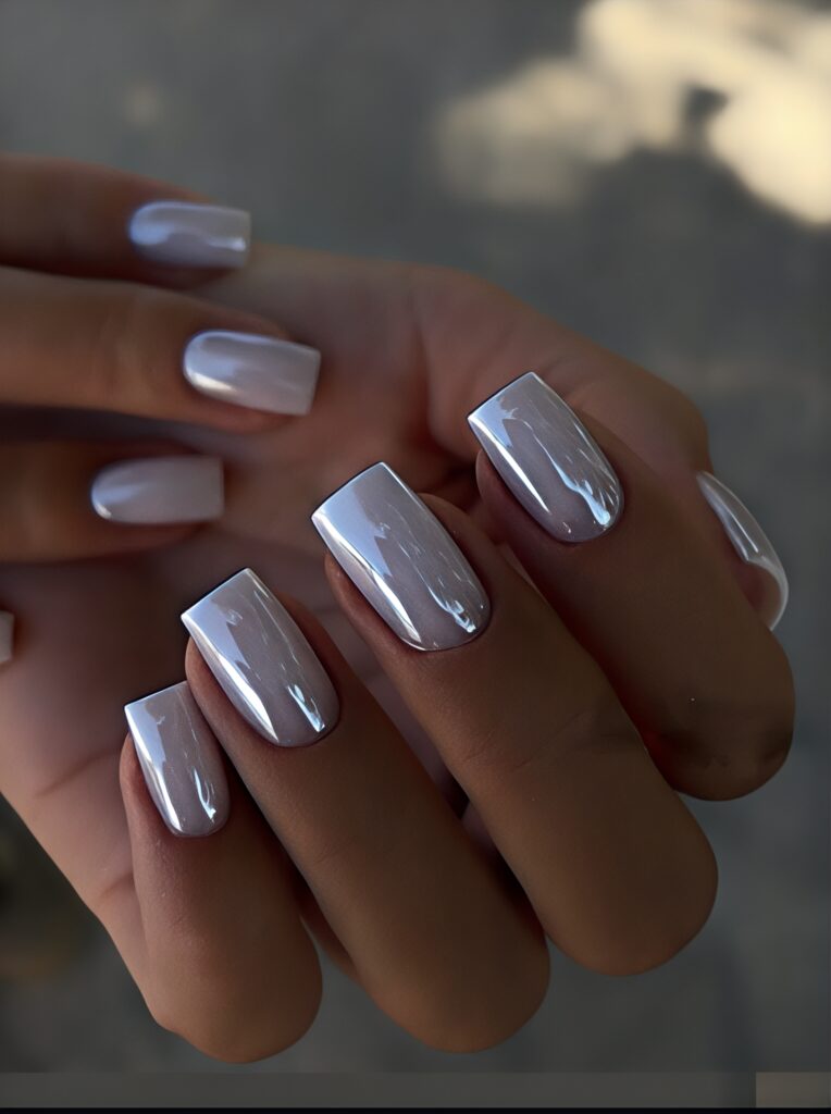 Pearl shine nails have a soft glowing finish that looks like real pearls. The color can be white, soft pink or light beige with a shiny top coat. When sunlight touches the nails they shine beautifully. This design feels graceful and clean. It is perfect for summer weddings or special events. The short coffin shape keeps the look elegant and easy to maintain.