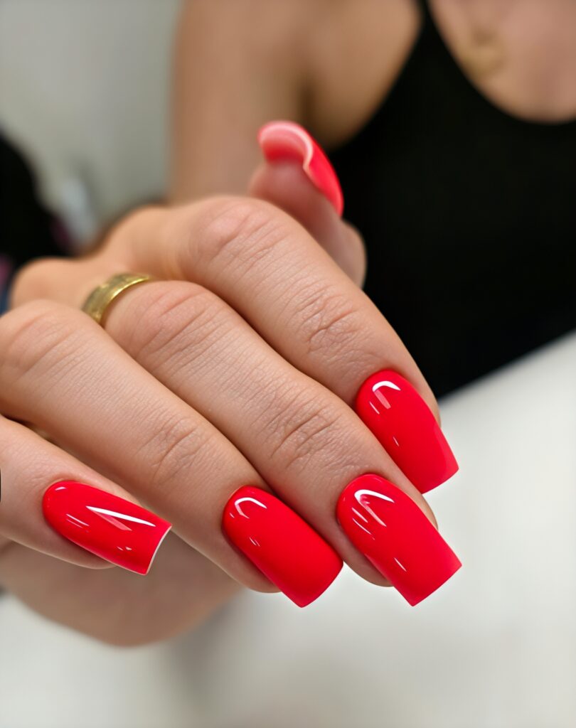 27. Classic Red Short Coffin Nails with a Glossy Finish