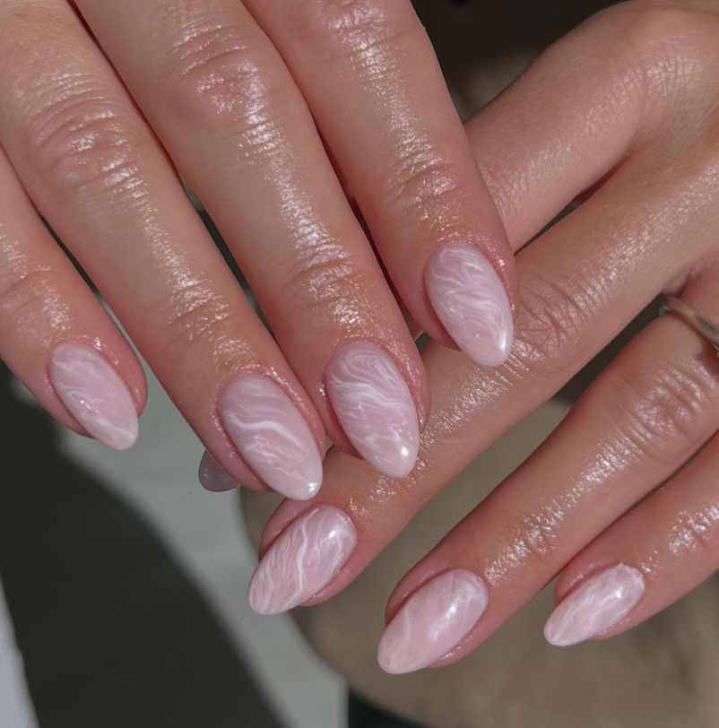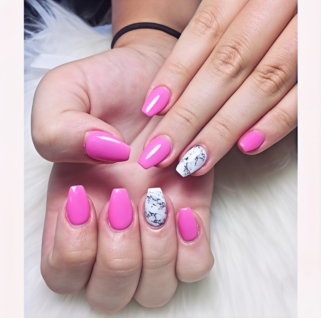 Baby pink nails look delicate and pretty. Most nails are painted in light pink while one or two nails have white marble designs. The marble effect adds a creative touch without making the look too heavy. This design feels sweet and modern at the same time. It is perfect for everyday summer wear and looks beautiful in natural light.